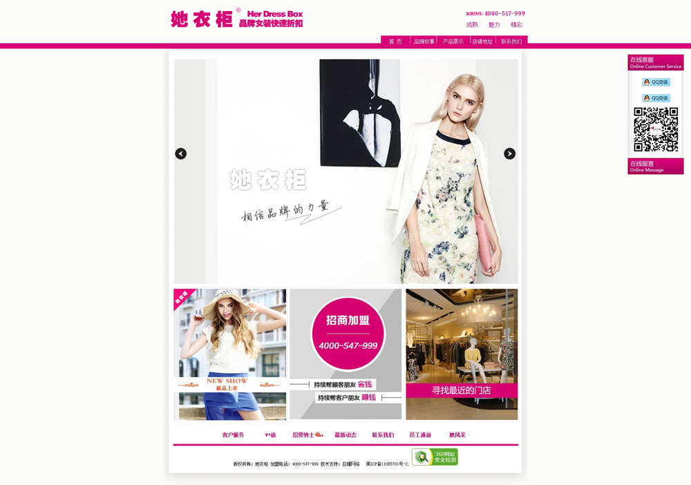公司旗下有“三份優(yōu)依”,“衣宴”,“她衣柜”和“她衣庫”四個店鋪品牌。經(jīng)過近十年的務實發(fā)展,已經(jīng)在全國開設直營家170余家,加盟店260余家,而且每天都在持續(xù)增長中,“她衣柜”目前已經(jīng)成為中國本土折扣行業(yè)最強、最大的品牌女裝折扣連鎖中心,我們有著遠大的目標:致力于打造雙百(100億、100年)企業(yè)是“她衣柜”不懈的追求。